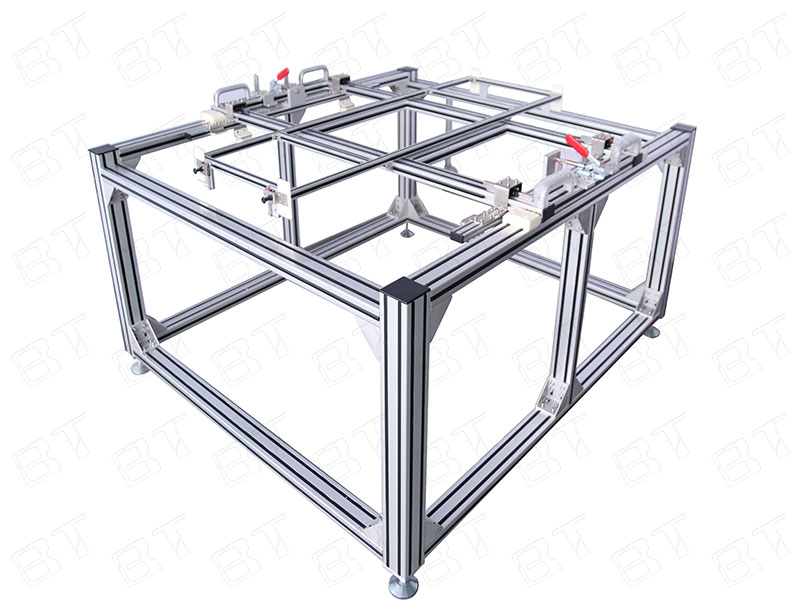 夾具是加工時用來迅速緊固工件,使機床、刀具、工件保持正確相對位置的裝置。工裝夾具是機械加工不可缺少的部件,用來迅速、方便、安全地安裝工件,應用機床夾具,有利于保證工件的加工精度、穩定產品質量;有利于提高勞動生產率和降低成本;有利于改善工人勞動條件,保證安全生產;鋁型材為框架,結合多種配件組裝,表面美觀大方,裝卸方便。